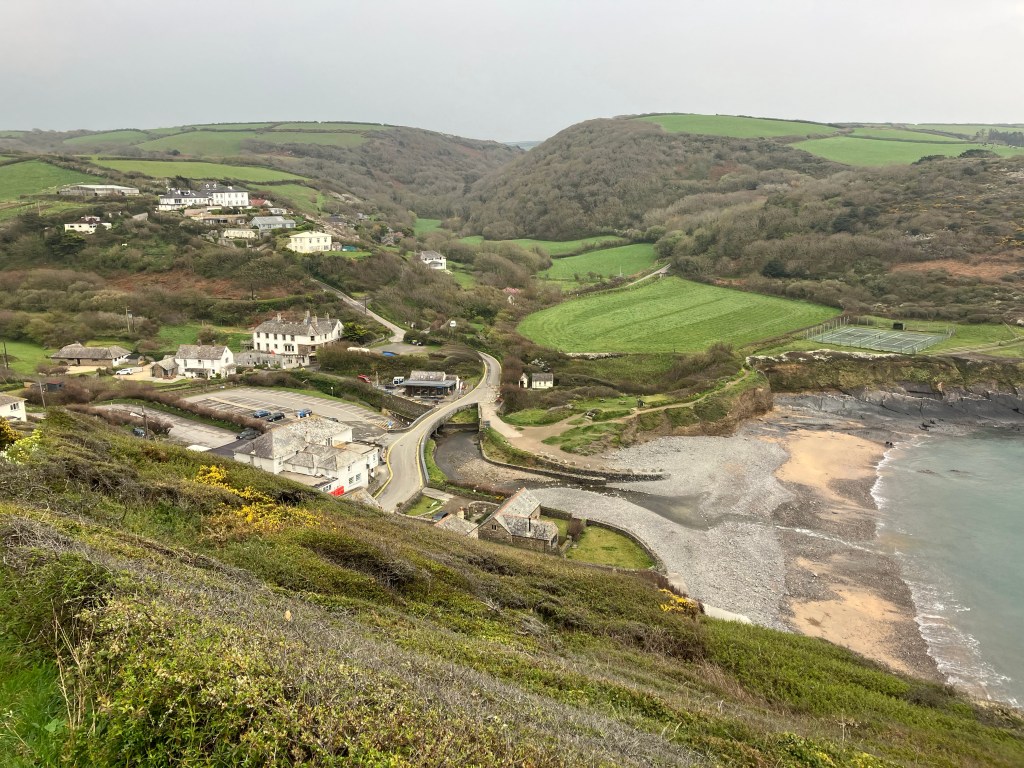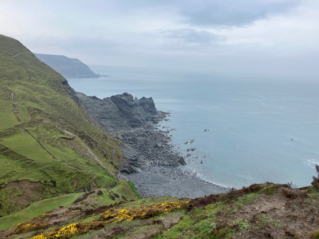 Leaving the comfortable farm lodgings and walking back into the cold wet world we’ve chosen to traverse seemed counter intuitive today. From the very start at Crackington Haven it was steep muddy climbing, little conversation with only our internal thoughts providing the needed distraction from the elements. Unfortunately for me, that was an even drearier place to find myself in. So, to cheer myself up I started to think about work and how to possibly rob a bank to pay for all this madness. We met a bloke called Mark on the way who was just taking his dog out for a walk. The said hound just stood shivering at his feet; I’ve never seen a sadder looking creature in my life before. Probably the only canine in the land terrified by the word “walkies”. Then the nutcases. First a young girl running, who from all appearances looked far too intelligent to be doing something so crazy. Next a group of people in daps and tee shirts who I’d expect nothing less from. Finally, a genuine ‘Mad Hatter’ carrying an enormous Flag! He was a walking, talking, badge bearing, hat wearing, big flag waving anarchist, totally bonkers – a man after my own heart in fact. His name was Johnny and he was outrageously at peace with everything and everyone, but just a bit scared of the ‘Queens of Hearts’ put in charge of us all. In this mad mad world it’s people like Johnny that make most sense to me. His Flag was big enough to put on the roof of Buckingham Palace, and let’s face it, where it is ultimately destined to be! Thankfully, no amount of wind and rain can put out the sunshine some people shed on us along the way.