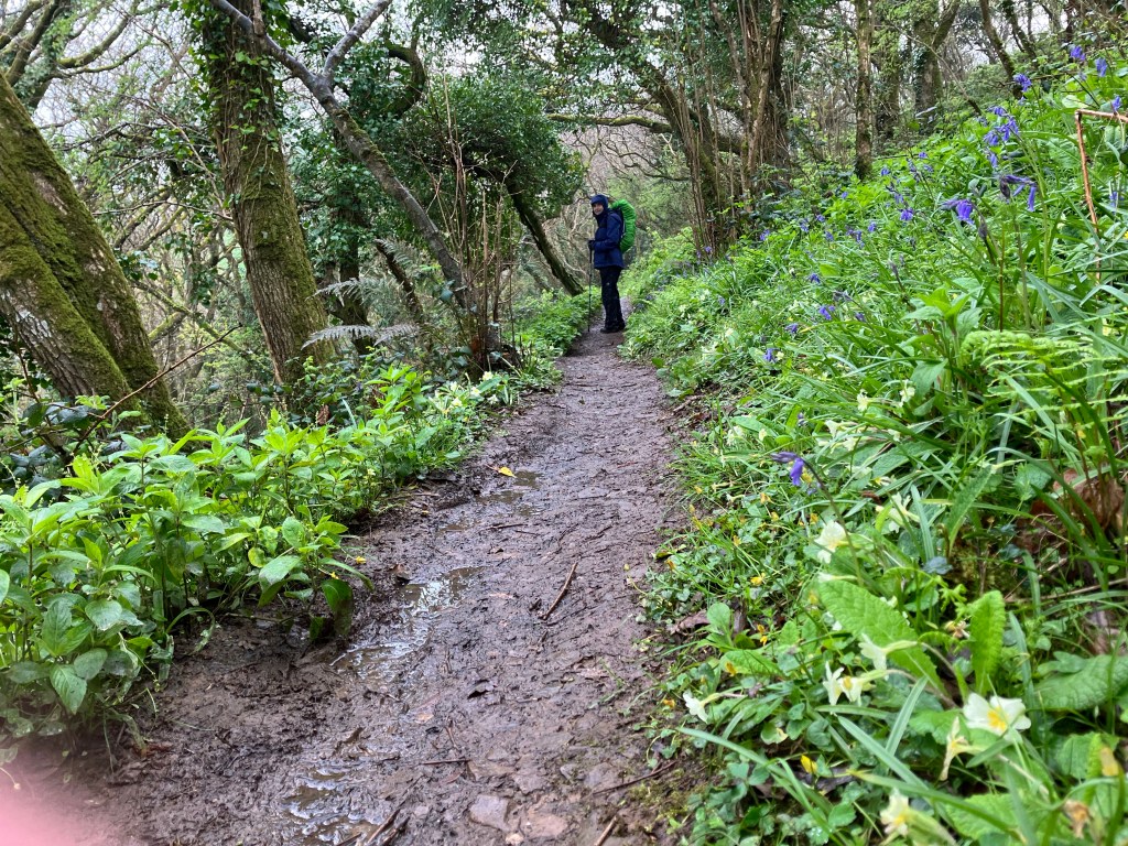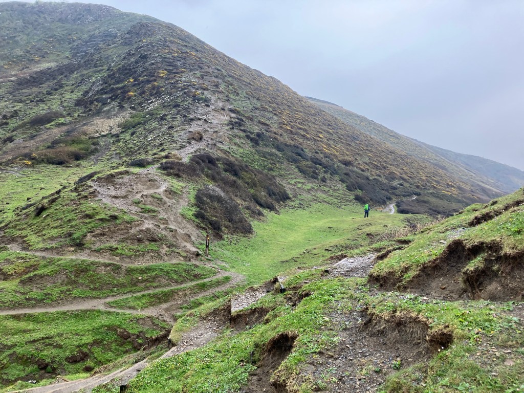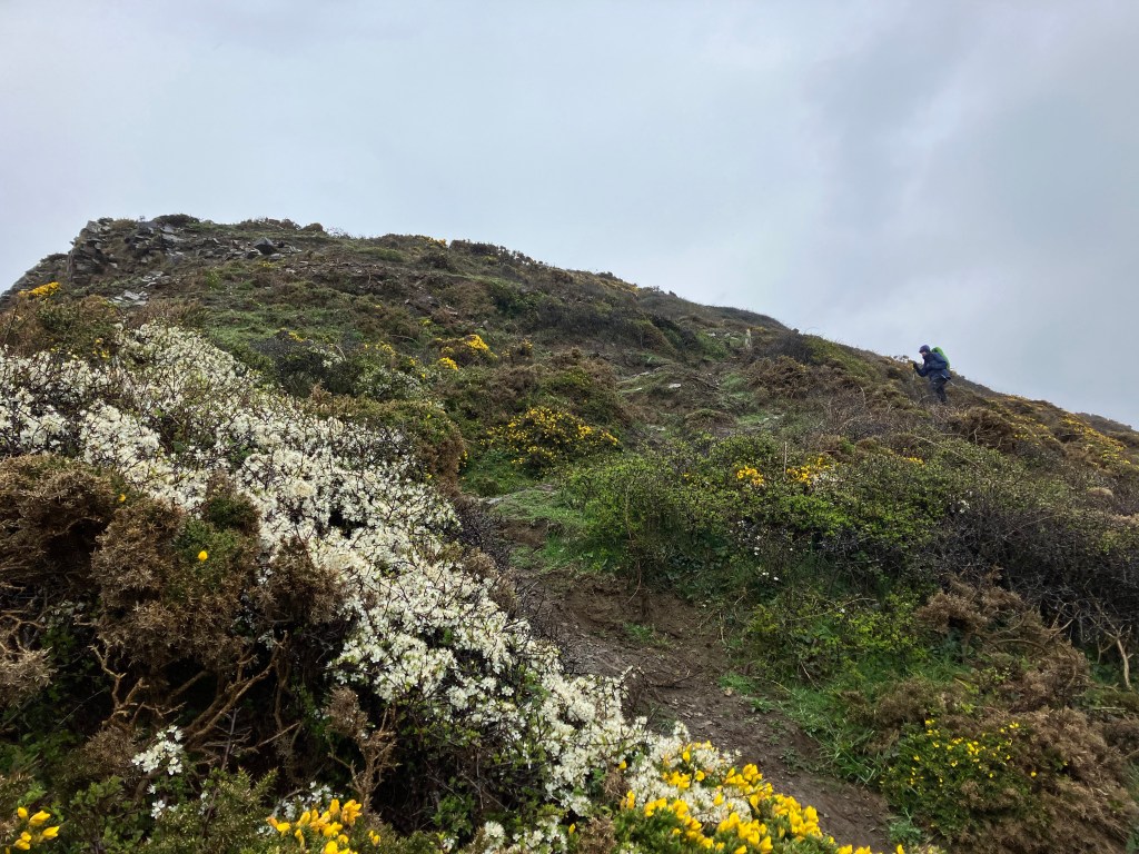 Today the forecast of rain all day was pretty accurate! We donned all our waterproof gear and when Matt dropped us back at the cove, we set off up the hill. Again it was pretty strenuous, and for much of the day the views were practically non-existent in the rain and mist! The paths were slippery and muddy, and at one point I landed on my bottom – nothing hurt other than my dignity! Only the keen walkers were out today, apart from one group of youngsters clothed in bin bags for protection against the rain!