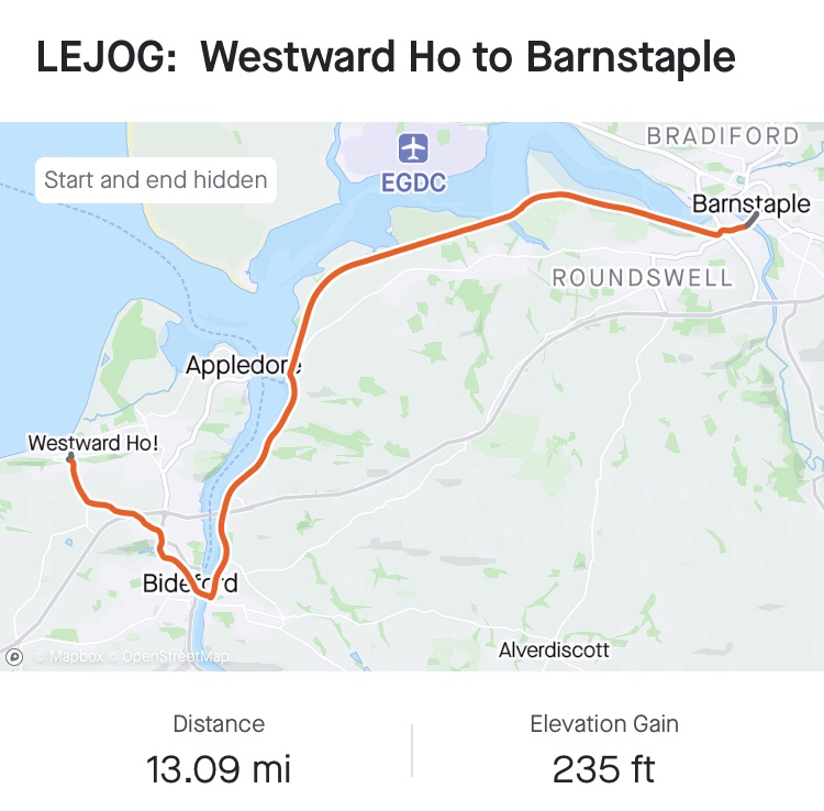 Today we left the coast behind and headed inland with mixed feelings. I love coastal walks and we will not see the sea again until the east coast of Scotland (if we make it) but I am not sorry that the terrain is going to be easier – we hope! We left Westward Ho and made our way through roads and footpaths to Bideford where we joined the Tarka Trail for the next 9 miles, a cycle track on a disused railway line which was completely flat! The weather was perfect for walking and the sun actually showed it’s face briefly towards the end of the walk.