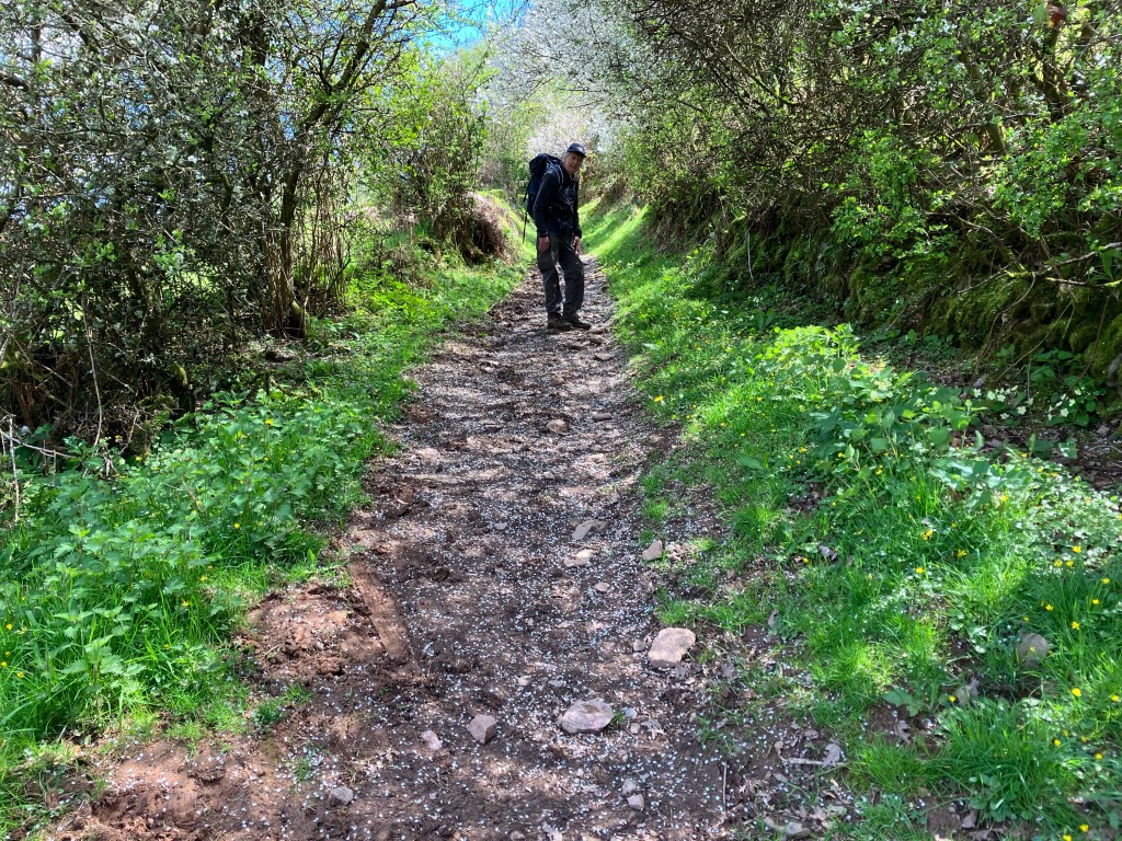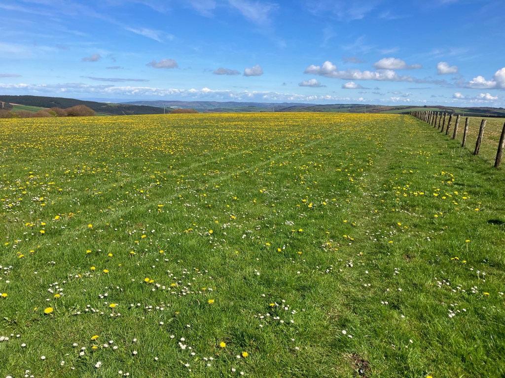 We left Warren Farm having spent a restless night trying to sleep on non-matching bedsheets, which our host had made a lame apology for. The agonies we travellers have to bear you can’t imagine. Up on the moor the menacing mist was claustrophobic company which we were pleased to see leave. Carol had an unfamiliar bounce in her step and I had a job keeping up as she hopped about all over the white tufts of grass hiding the sucking mud below. We followed what we imagined to be narrow paths which turned into muddy baths, the going was grim. Out of nowhere we crossed a road climbed up out of a car park and were suddenly on firm ground with ponies grazing all around us, then onto a stony path through open wooded landscape where we heard a cuckoo practicing for a 24 hour clock appointment. By the end of the day we were walking across wide flat open fields covered in my favourite flowers, the kind of places that Julie Andrews would find difficult to keep quiet in. A long but very pleasant day’s walk.