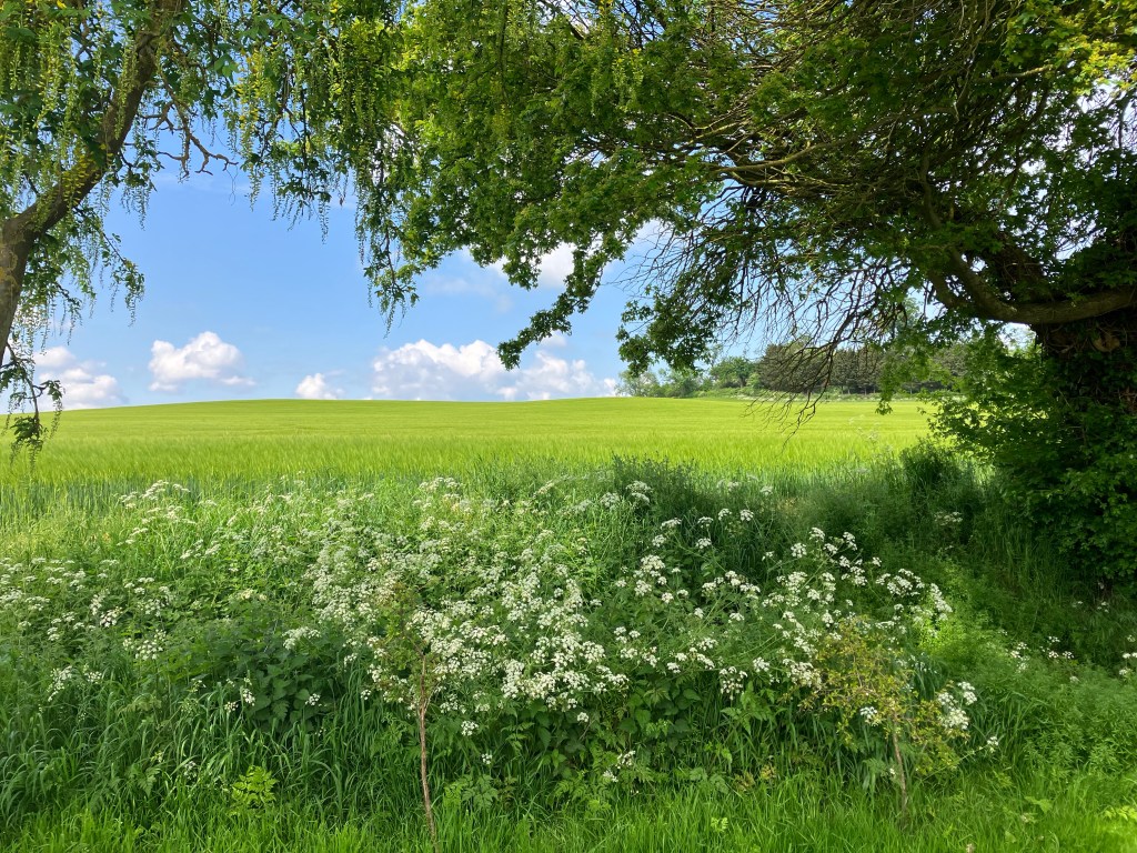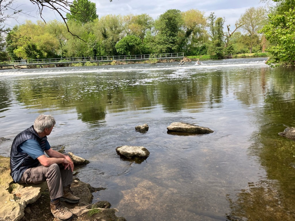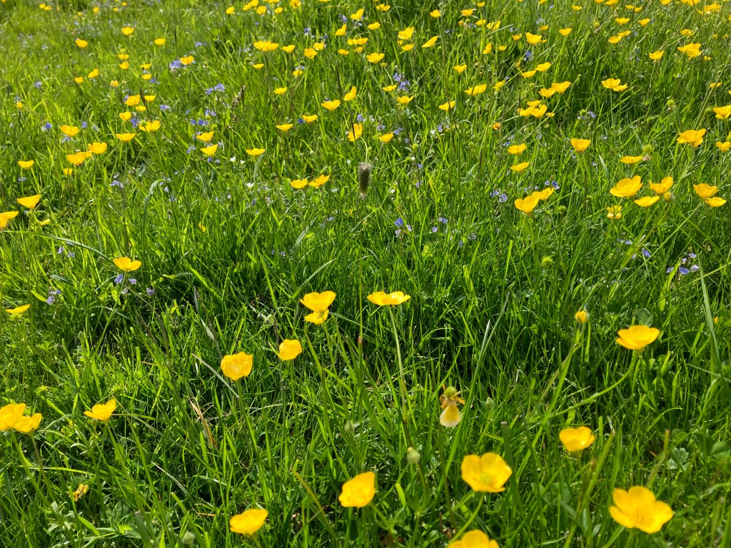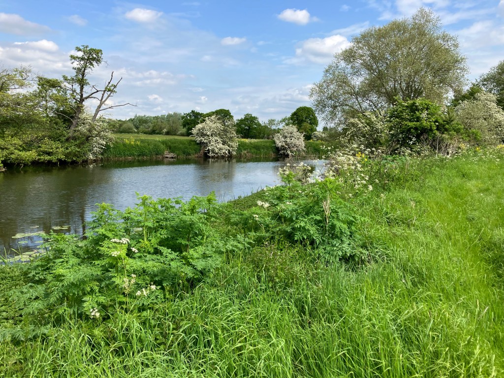 Our walk took us past acres of glass greenhouses, some in the process of construction. The irony of all the human effort being made to force grow exotic blooms in glass cathedrals, whilst surrounded by fields of nature’s more splendid floral grandeur was not lost on us. Our route took us alongside the River Avon whose banks were festooned with hawthorn trees in full bloom under a warm blue sky, across fields of buttercups again and through narrow lanes of squelching mud of course. The latter part of the day was spent treading better paths and then pavements into Alcester; over fourteen miles of the good, the bad and the muddily.