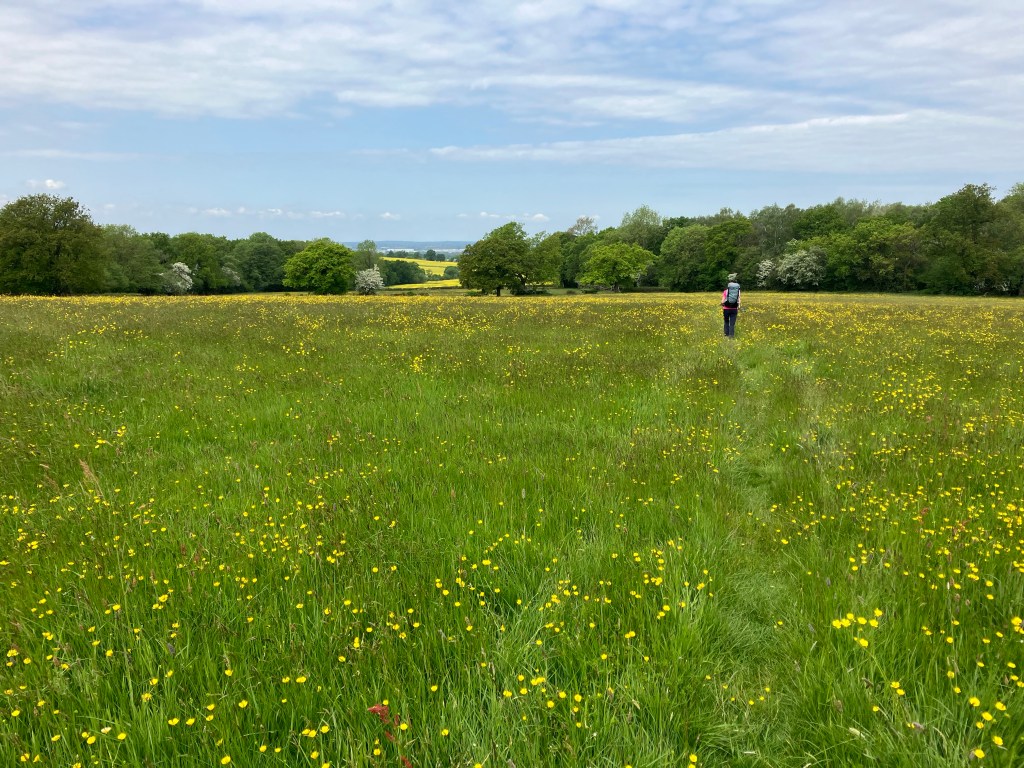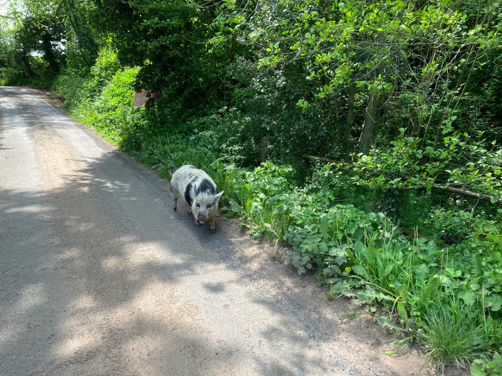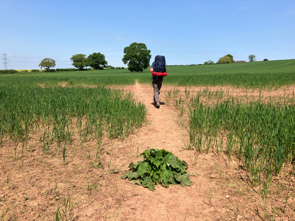 I always get to where I’m going by walking away from where I have been” (Winnie the Pooh). Today we will have walked up past the geographical centre of England, so from here on most of our walk across England will be behind us. Just before we left our lodgings today a crow banged it’s beak repeatedly against the large full height window of our bedroom from a rail outside on which it was perched. It looked for all the world like it was trying to tell us something. It turned out to be another sunny day’s walking, nearly all flat and on good hard baked paths across and around fields, interspersed with short sections along country lanes between high hedgerows. Found a four leafed clover (shamrock), and I wasn’t even looking for one. The odds are about 10,000 to 1 of finding them, which translates as over 27 years if one goes out every day looking! This was becoming a peculiar day indeed, when all of a sudden we met a small pig on it’s own in a country lane we were walking along. The pig followed us until we had to climb over a stile into an adjacent field, where it sadly watched our departure into a wood as we disappeared into head height cow parsley. An enjoyable and unusual day, but the temperature got up in the afternoon, making our trek along a two mile road to the golf club, where we were staying, feel like an eternity.