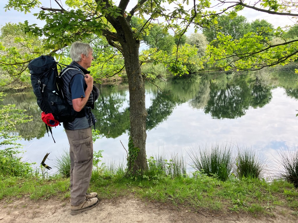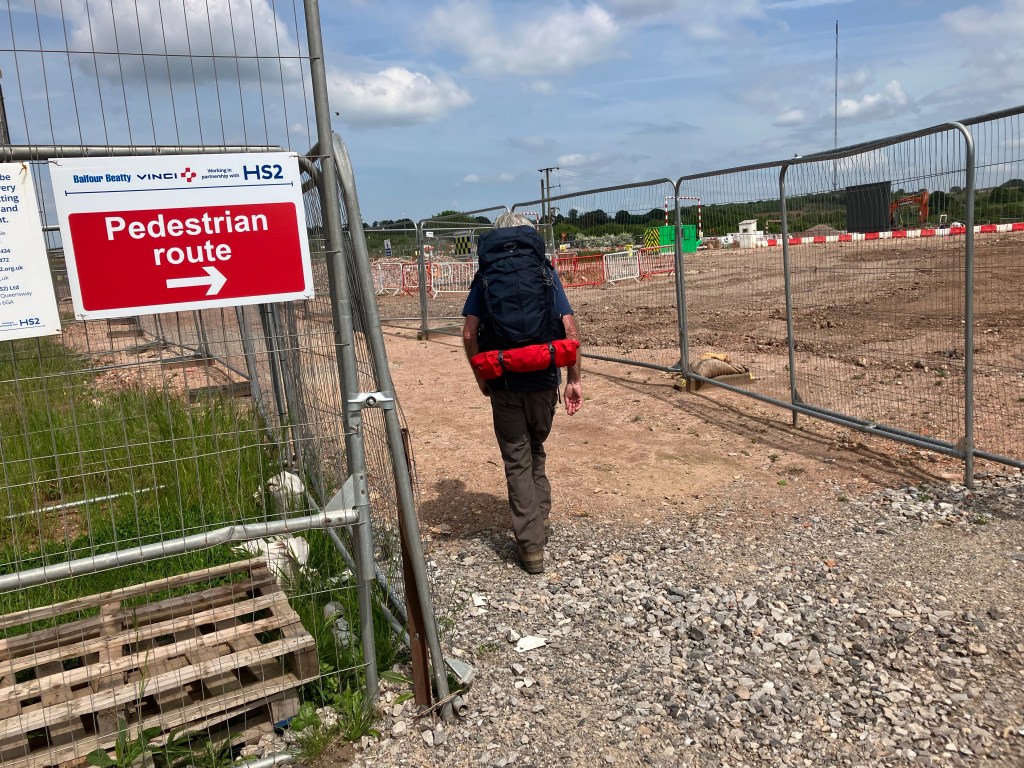 Today was a long, hot, dry walk on good paths through parkland, along a canal and across large fields that herds of curious cattle kindly galloped across to make our acquaintance. The warmth forced us to stop three times for victuals and bladder top ups and three times the promise of a pub near the end of our trek got us up and moving again. We met a couple who were walking ‘The Heart of England Way’ over a period of many years studying its indigenous species and history. These are the people who deserve recognition, they quietly go about making notes of the subtle changes that are determining the future landscape and wildlife in the area. They spoke briefly to us about the impact of the HS2 construction work on the native ‘swallow’ population, not in a critical manner, but with an appealing, caring concern. We later met a farmer who got down from his tractor to welcome us into his world. He was growing a huge field of carrots and parsnips and picking up on my incredulity, explained how the stony ground was made perfect for the job. Technology enabled the separation of stone and earth to provide a tilled soil as fine as sand. He pointed out trees he’d planted over thirty years ago and how he was keeping a three to six metre margin around his land to encourage habitats for various creatures including partridges. People like ‘Jasper’ are not as rare as I’d thought and just a short time with him explained a lot of the clever provisions made by other farmers like him in fields we’d crossed while ignorant of the subtle reasons for the unusual crop layouts and their borders. The pub was closed!