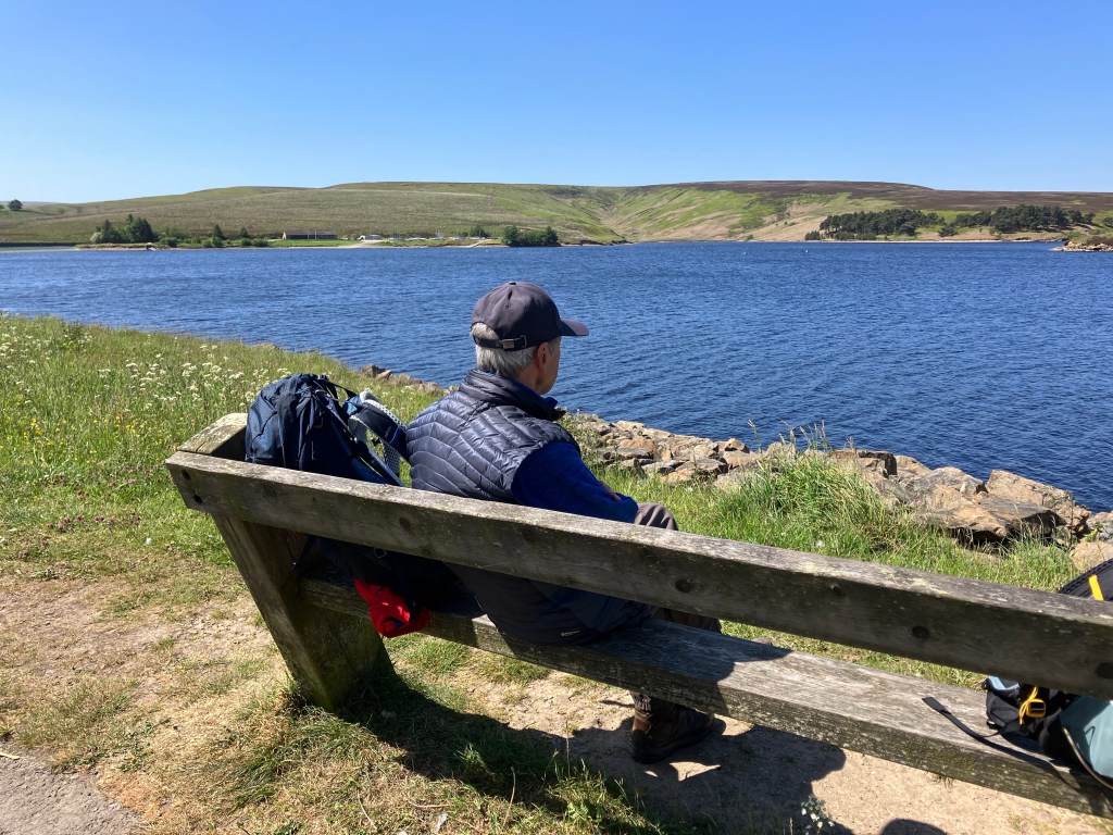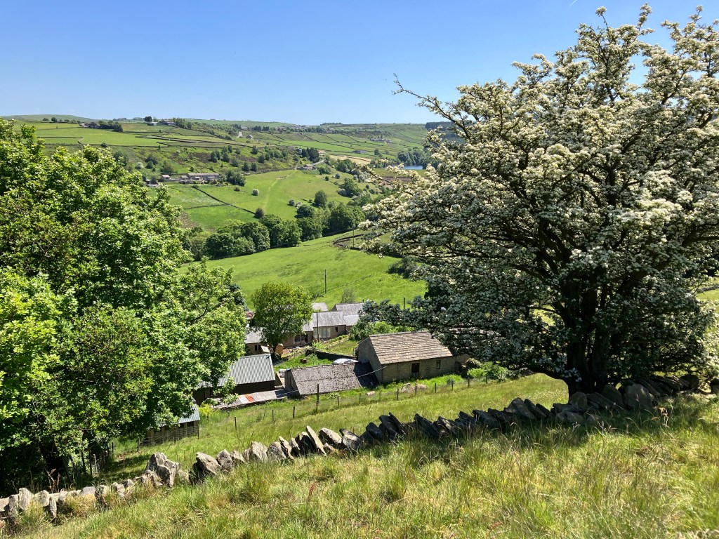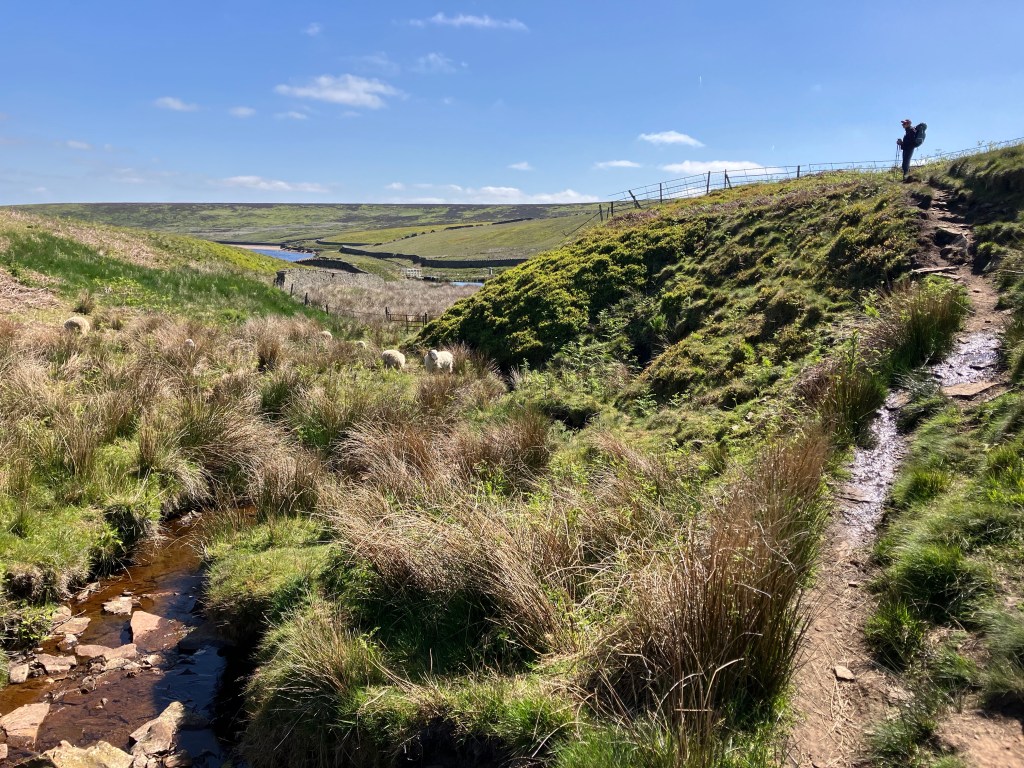 Shorter more enjoyable walk today that took us through pastoral areas closer to human habitation. Firstly up through moorland again with associated curlews for company, but also alongside the busy A628. Then around reservoirs where we crossed paths with cyclists and others just walking around; probably shareholders out admiring their liquid assets. From there it was up and down hills through conurbations where we saw dog walkers aplenty, one had six large dogs tethered to her, but where she’d tethered all those essential black plastic bags wasn’t obvious. The end of our walk was down through a planted pine forest then up over steep hills through fields giving us glorious views over all we’d trod earlier. Arrived exhausted at our digs ready for an extended break.
