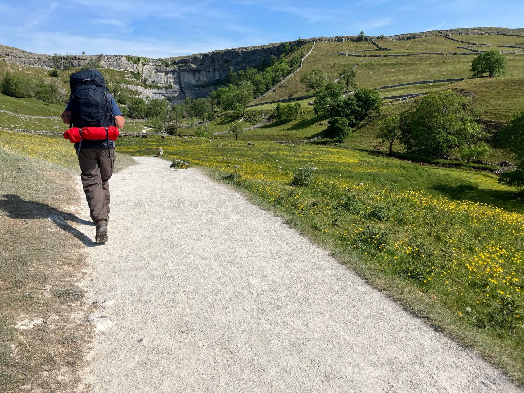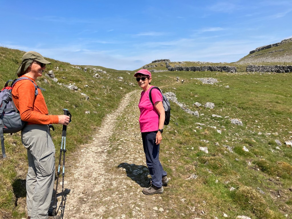 After bidding farewell to Ros, Max joined us again for the first part of today’s trek. Starting out in cool sunny weather, we made our way to Malham Cove on the Middle Craven Fault, a spectacular 230 foot high white limestone smooth cliff face. Thousands of years old, in it’s time it would have been a thunderous waterfall higher than today’s Niagara Horse Shoe Falls at 180 feet. A shelf of flattened smooth boulders greeted us after a long climb up stone steps tracing almost as vertically one edge of the precipice. A beautiful creation by huge amounts of water and time, now a balmy popular picnic spot for strange tiny visitors during a brief interlude of it’s 12000 year history. On the way up we met Amy who was walking the Pennine Way and whose company we enjoyed until our paths forked at Malham Tarn. Then after climbing East away from The Way we crossed its crest and continued on a gentle descent to a lunch stop just before a steeper drop into a river valley. After lunch we bade farewell to our good friend and set our sights on The Falcon Inn where we enjoyed a long drink before scaling the opposite side of the valley then down to another river where we walked it’s flat grassy bank West for about two miles to Buck Inn, bath, meal and bed zzzzzzzzz.