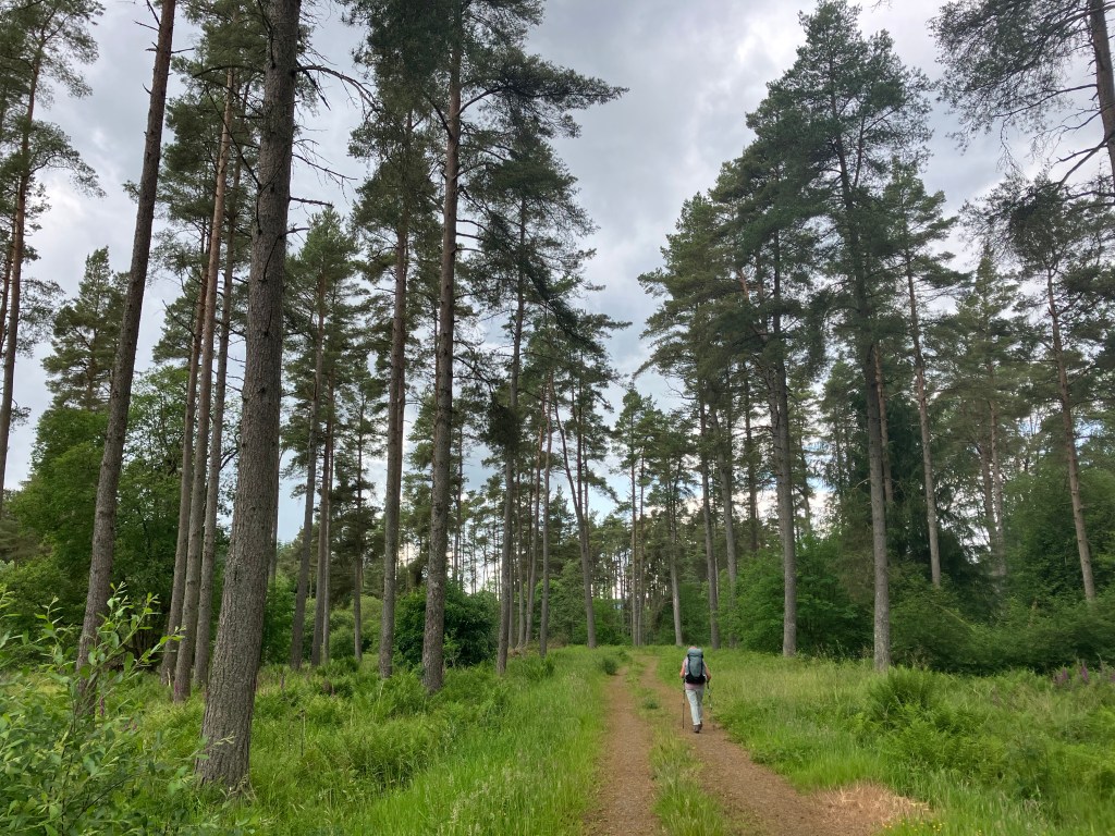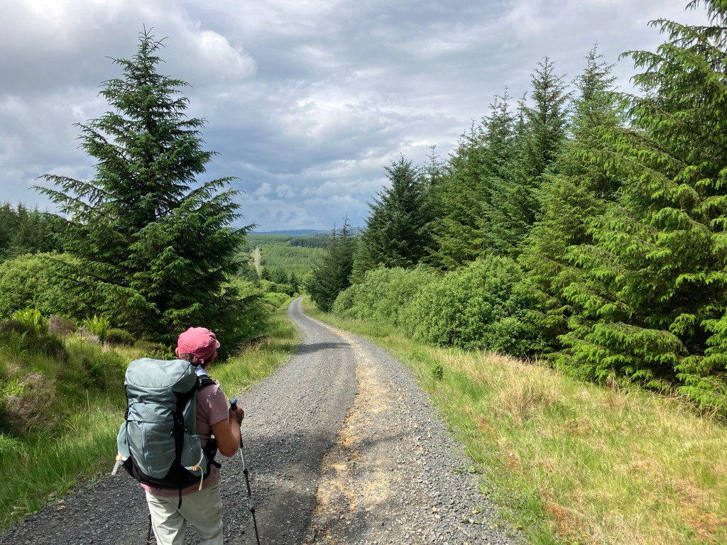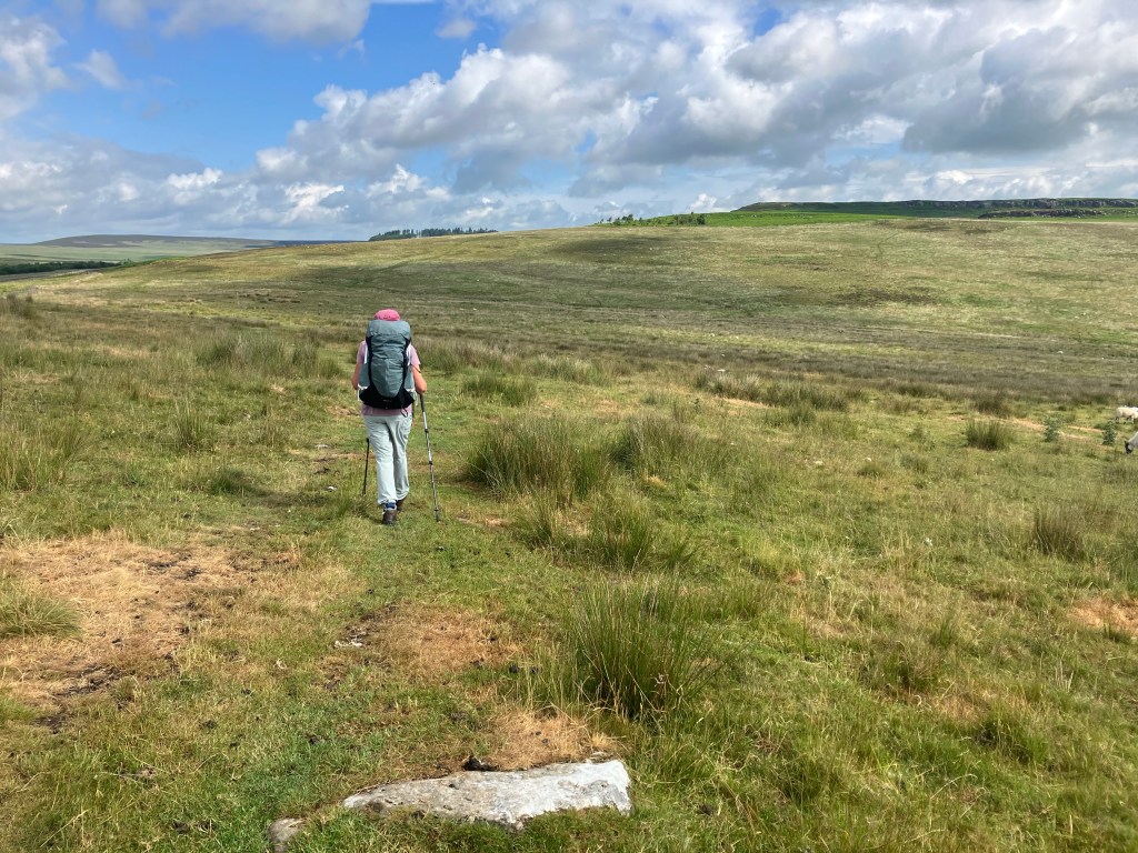 I was expecting today to be difficult, particularly after the rain yesterday: the guide books suggested that the walk across the moors is really boggy. However, we awoke to sunshine and a strong breeze and had a lovely walk, initially climbing through fields of sheep and then onto the moors. We were able to avoid the wettest parts, and the hills were gradual climbs up and down. The second part of the day was through Redesdale Forest on straight wide gravel paths – not comfortable underfoot! We met other walkers, and discovered that we were all staying at the same accommodation.