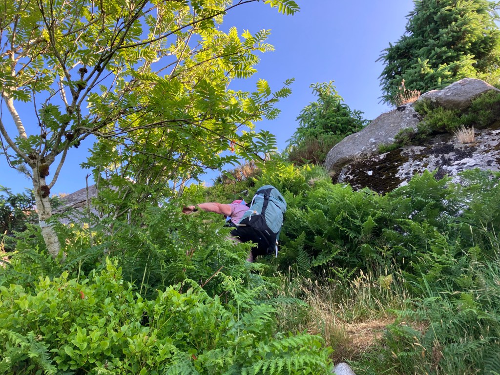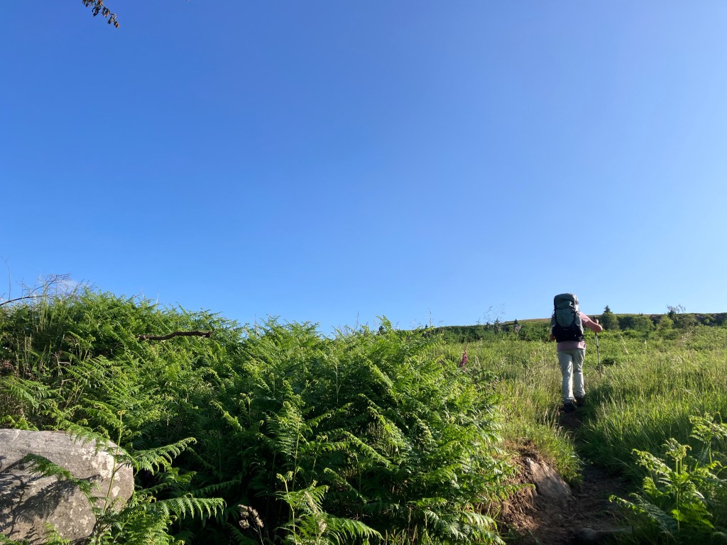 We set off early and it took us an hour to climb/scramble up the hill from Byrness through the forest and onto the moors. We finally said goodbye to the Pennine Way and turned onto Dere Street, a Roman Road, and into Scotland. Although the ‘road’ was not easy to follow initially, it was pretty straight. We ploughed through boggy undergrowth, followed the path alongside walls on farmland, walked on tarmac surfaces and then narrow paths. All this on undulating hills, before we finally descended into Jedburgh, grateful to arrive at our accommodation for the night.