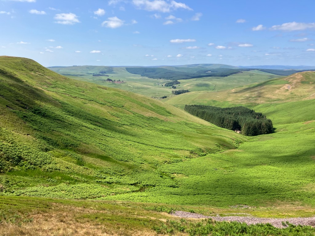Woke up this morning in a bit of a panic when I realised we were entering Scotland and neither of us knew a word of Scottish. I worked with a friend and colleague from Glasgow for over twenty years and in all that time never understood a word he said. He’d say, “Yer Bums oot the windae so haud yer wheesht ye dobber”. I’d just nod pretending to understand and reply, “Och aye Jimmy”, and he’d smile thinking I did. We did a short but steep ascent to the top of Byrness Hill and continued along the Pennine Way; pleasant walking, occasionally soft underfoot but with glorious views all around. The border crossing for us was a rotten wooden gate in a wire fence, so I opened the gate and the yett closed behind us; we were in! The way quickly became impossible to find, but we saw Greg and Victoria who are also LEJOGers striding purposefully behind us. After minimum pleasantries, they pushed on ahead, but it wasn’t long before Carol decided their route was dodgy, so took another way. Soon they were behind us again, keeping about a quarter of a mile distant and watching every move we made. I felt so proud of my expert explorer with her backwoods tracking skills. To annoy them we stopped at a gate to let them pass, which they reluctantly did, but unfortunately the path soon became a lot clearer and again they accelerated out of view. After some time crossing hills of open grassland the way became quiet tarmac roads winding up over interminable hills. We’d drunk all the water we had and when eventually reaching Spread Eagle Inn, after asking for two pints of O&L, were only given two tiny glasses – we didn’t get off to a great start! But nothing could quench the good feelings of having made it into Bonnie Scotland.