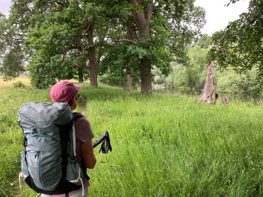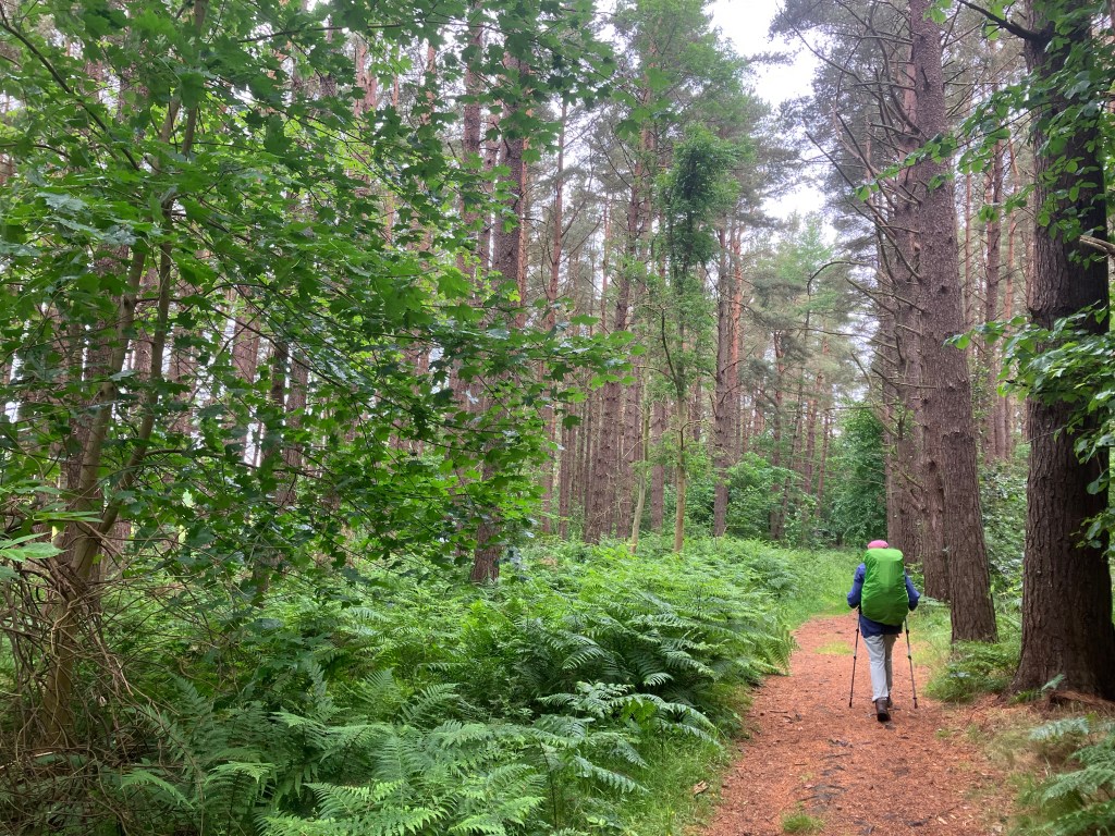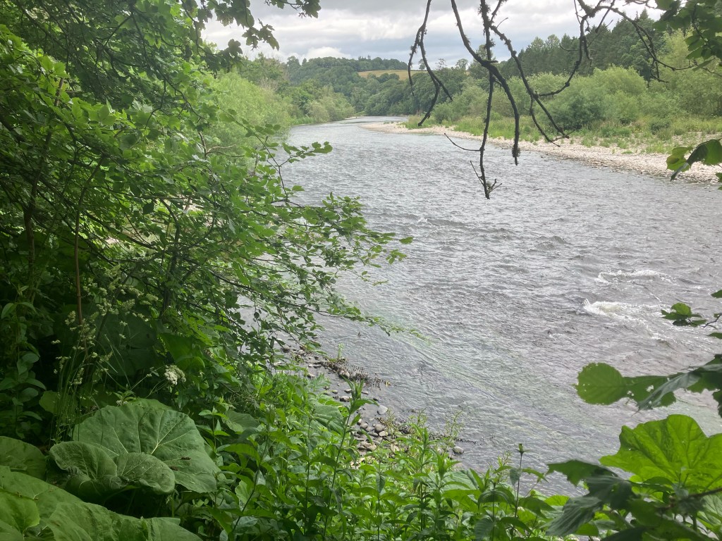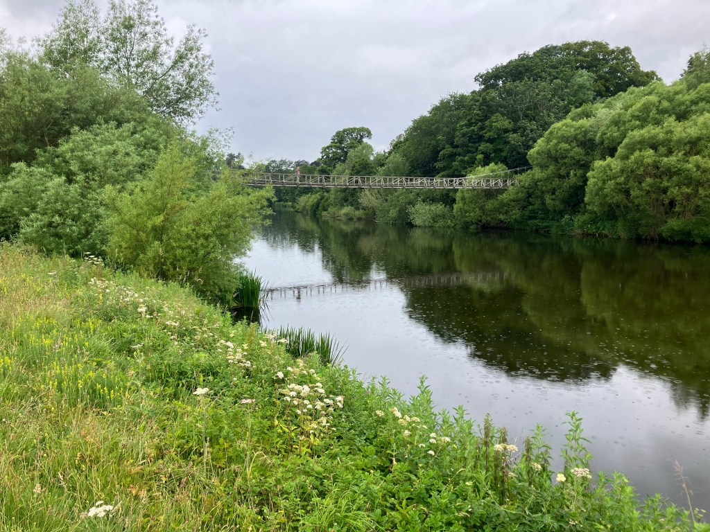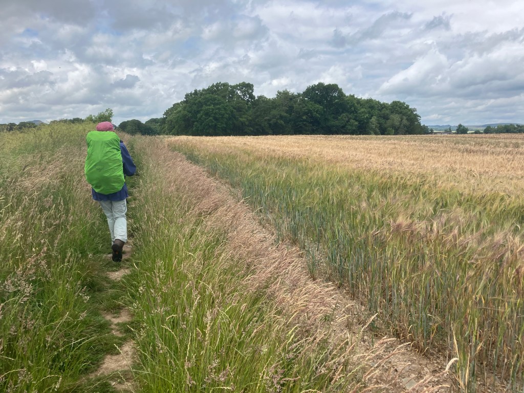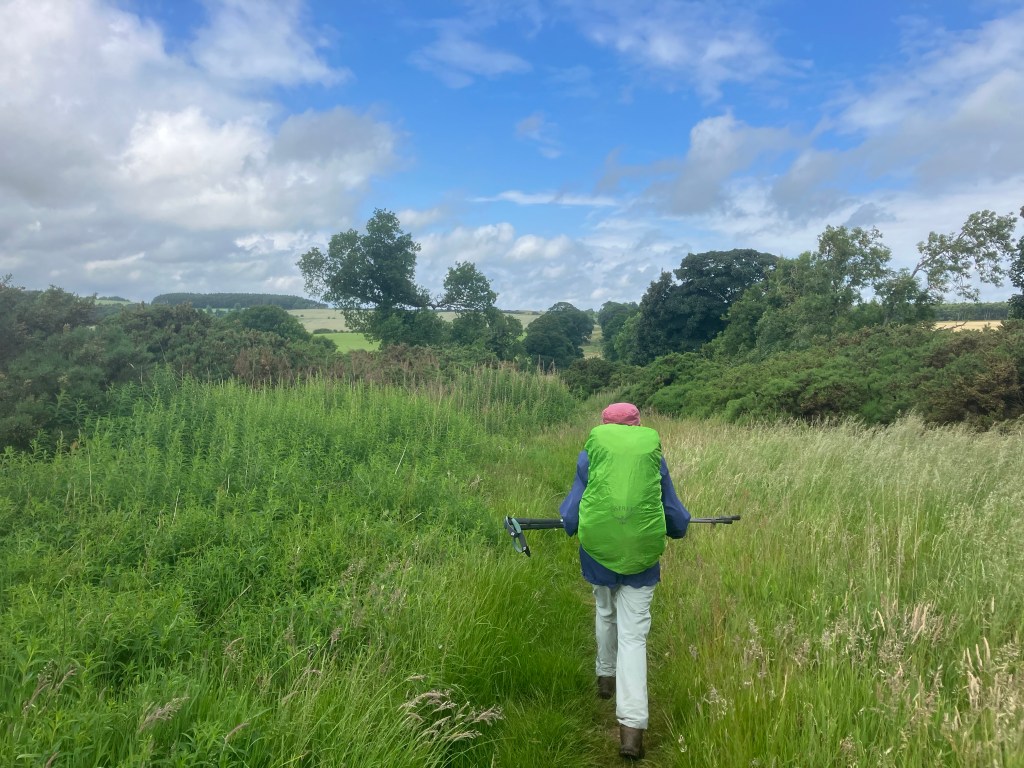Today we followed St Cuthbert’s Way for most of our walk. The terrain was varied, sometimes on clear paths, then woodland, followed by struggling through waist high grass. The promised showers arrived but fortunately didn’t last long, but we have wet boots after walking through long grass! Our walk ended on a lovely path alongside the River Tweed to reach our accommodation at Dryburgh Abbey Hotel: a taste of luxury!
