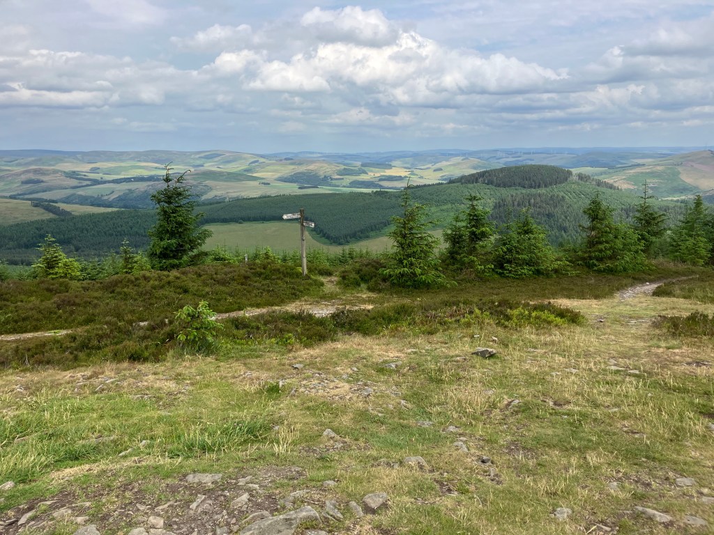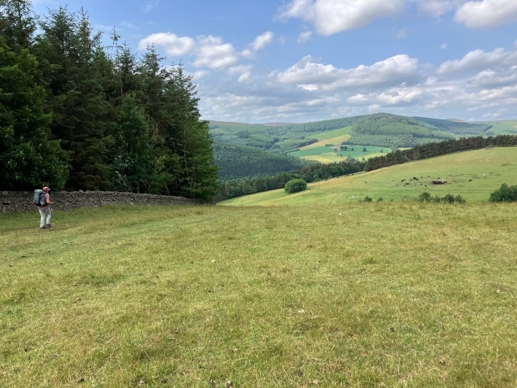 I must admit that I didn’t enjoy today’s walk, despite the views from the hills. I think it is because I am tired and looking forward to a rest day! We left Galashiels in good walking weather, sunny with a pleasant breeze, following the Southern Upland Way. But from the start we were climbing. Initially we climbed over moors accompanied by sheep as usual. Then we were climbing through pine forests, about four miles moving steadily uphill! By the time we were at the top, ready to picnic, the rain which was forecast arrived. The rest of our walk was in torrential rain, and we arrived finally at our guest house like drowned rats! We were soaked to the skin and were relieved to have a room with a bath. In clean, dry clothes we were able to embark to a pub for supper – in sunshine!