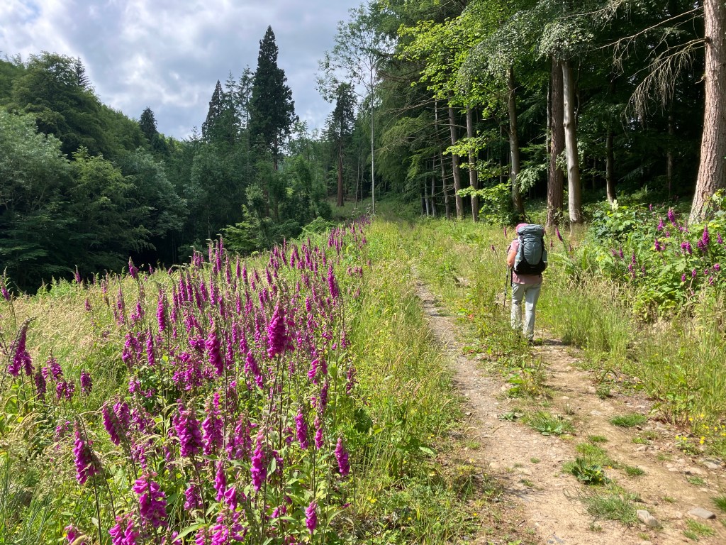 Today Carol told me that I smell. It’s the kind of information she gives me regular updates on, but this time was different and said in realisation of its broader implications. The other day we arrived at a hotel reception and were asked whether we would prefer to have dinner at the bar or at the upstairs dining room. I wanted the dining room but Carol said we didn’t have a suitable change of clothes. It’s OK I protested, I’d change my socks before we went up, which had everyone else in the reception area rolling about laughing – but I was serious. I really did have a pair of socks in my bag that I’d only worn five times. We’re only two days from a launderette at the moment, which is both good and bad, if you know what I mean. From the start and for seven miles of non stop aching it was uphill, mostly along stony lanes through woods and a lot of narrow hedgerows. There were few opportunities to gaze at the impressive hills around us, partly because of the tunnel like nature of the climb but also because the sky was getting darker by the hour. When Komoot could find no further hill to climb we rested our bodies, had lunch and changed into our wet weather clothes. The next seven miles was along a ridge then down a long descending slippery path in pouring rain to Innerleithen. All this time I was attempting but failing to take photos of a bedraggled woman using drenched phone and fingers, until arriving at our lodgings even smellier and wetter than when we left Galashiels. An exhausting walk reminding us of our first days in Cornwall with family.