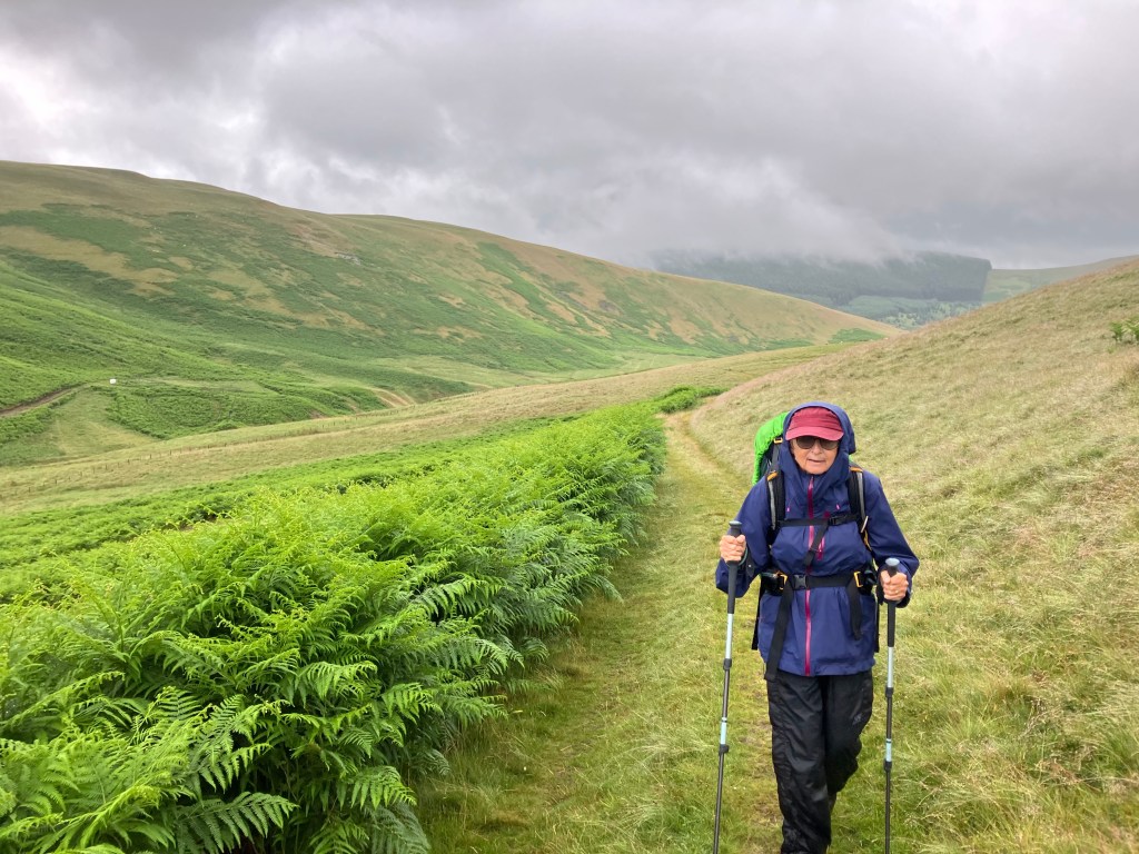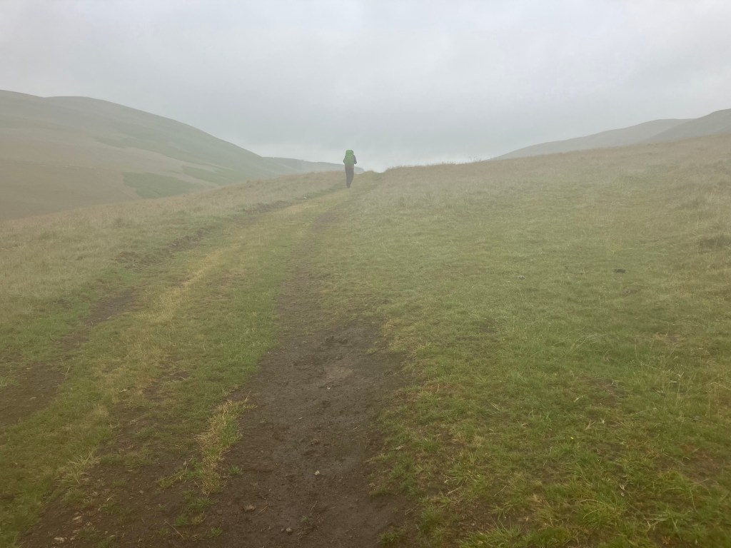 Today we woke up to rain, and it didn’t let up all day. It was a walk up and down hills again, and not really enjoyable, as the views were shrouded in mist. And of course it wasn’t possible to stop for a picnic. We followed the Cross Borders Drove Road for most of the day, but had a half mile diversion on the path because a landowner had put up fences where the marked path was meant to cross his land! We arrived at the Gordon Arms pub, bedraggled and muddy once again!