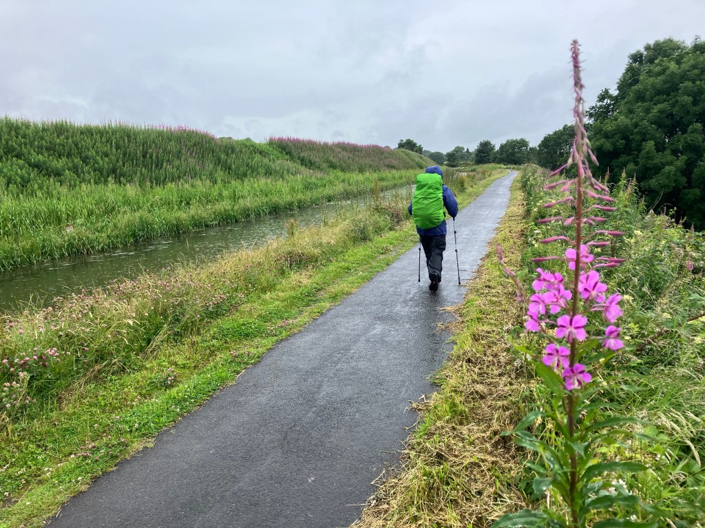 When walking through woods I’ll never step aside for a gnat, but along a busy road I’ll always move out of the way of those stampeding elephants on wheels. Carol has a different world view and will dodge insects all day, but will stand her ground when facing traffic in pouring rain walking up the wrong side of narrow roads. Her argument is; “they’d have to move over for cyclists so they can move over for me”. However, although the logic is sound, it’s not splatter proof, and I feel quite passionate about that. Probably the most animated conversation since starting our walk in fact. The weather never let up, but the dangerous road walk and argument did thankfully and we were soon safely treading canal paths and pavements all the way to Linlithgow. (Although I did feel in danger of finding myself in the canal for a good amount of that time). Canals are a quiet unhurried oasis, often parallel with busy roads and railway lines, and the engineering associated with them added to my enjoyment, despite the rain.
