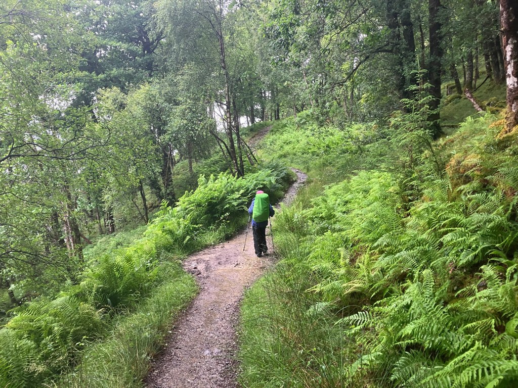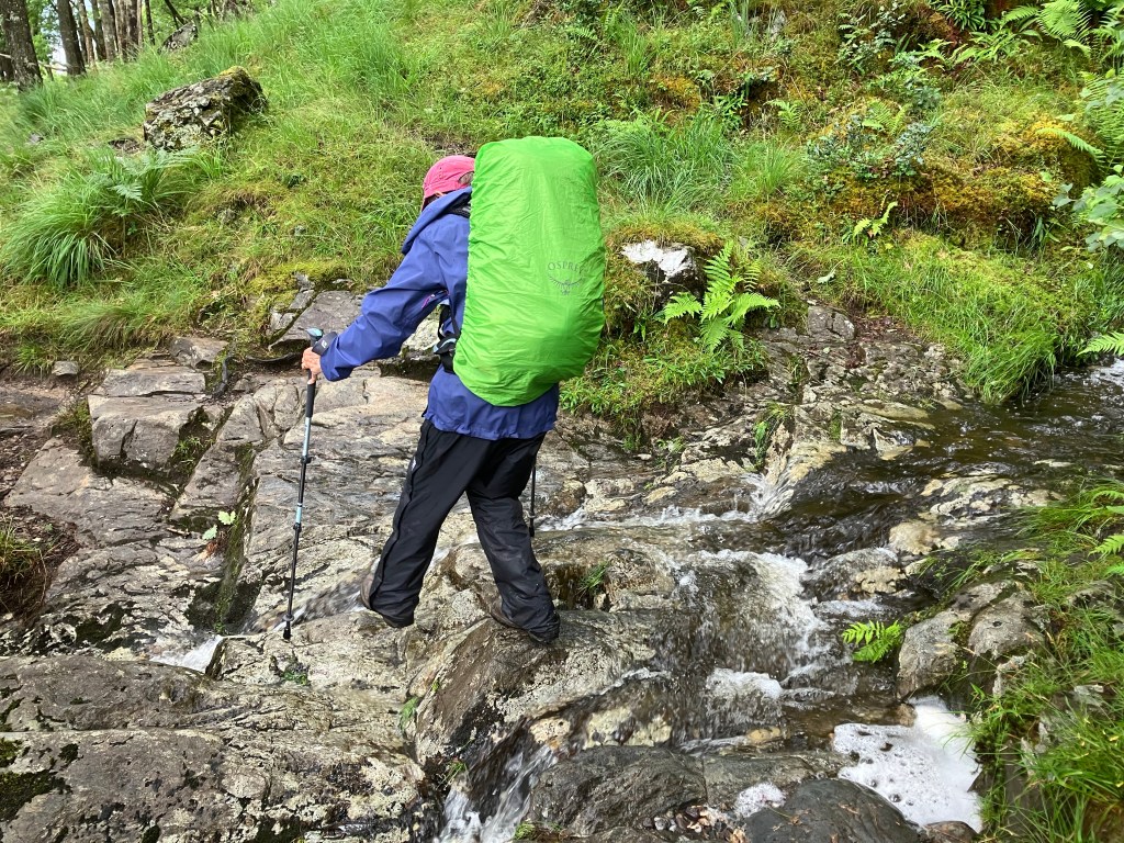 The taxi delivered us to Rowardennan and we set off once again with our rucksacks. There are two alternative paths alongside Loch Lomond, and because it was very wet we chose the upper path, a very easy logging route. However the two routes eventually converged and we were soon struggling over tree roots and rocks and were fording streams. We were never far from the sound of water, as there are numerous waterfalls. Arriving in Inversnaid, we stopped for lunch at the hotel before diverting from the WHW to our guest house by Loch Arklet.