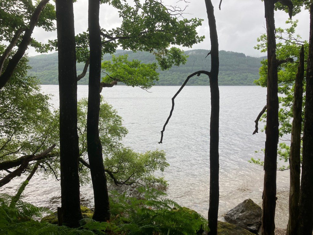 Today was interesting. Starting from the hotel car park where we arrived yesterday, we followed signs to West Highland Way and soon were tracing the shore of Loch Lomond on our left again, but now at a higher elevation through a thick pine forest. Water cascading down from the hills on our right was impressive as too were the culverts diverting the deluge under the path we were on. We commented that walkers on the lower path nearer the Loch would probably have to negotiate the torrents and we felt quite smug about choosing the higher one. Soon the lower path rose up the hill to join ours and we were suddenly scrambling over boulders and climbing up tree roots along a sometimes narrow ledge. It’s frightening and surprising that the walk actually allowed those using it to traverse the roaring cataracts without helmets and diving suits. Carol said “you go first”. We’ve been here before I thought, only last time we had Otto to show us how. There was the slippery looking stepping stone. So taking a deep breath I stepped into the thundering maelstrom. Carol quickly followed behind, and pushing past said “keep up”. This is not for the faint hearted I thought as we continued up the twisting bone breaking rocks, when I saw coming towards us down the slope on what looked like a chopper bike, a blond haired child about ten years old bouncing all over the place. As he passed he didn’t even glance at me, his steely eyes fixed on the rocks he was some how managing to bump his bike over. Two things crossed my mind in that moment, where did this crazy child come from and, the poor chap’s going to have to carry his bike all the way back when he meets the shocker we’ve just had to cross. But within minutes we were facing another rushing wall of liquid ferocity, but this time no stepping stone. But that’s not possible I thought, I must be dreaming, but reality kicked in when Carol repeated her mantra, “you go first”. I looked at the throat the water was crashing straight down into, feeding the insatiable loch a hundred feet below. That child on their bike crossed this! After much trepidation I did what I’ll only describe as a ‘highland fling’ landing on a dinner plate sized flat stone where I did a Scottish Jig (hands waving over head, hopping on one leg while twirling on the spot). Carol was not impressed and rearranged the look on her face from fearful to terrified. Passing across her walking poles it was agreed we’d use them to help her make the leap. Knowing she was clutching at straws, she closed her eyes and did what many of us do when our options get desperate. Then miraculously a firm arm appeared alongside the poles with the kind of hand that could unscrew tops from jars of unopened marmalade. Immediately Carol transferred her trust and was pulled safely across by a young chap who’d just arrived behind me. “Good one” he said and immediately leapt the gap as though the water wasn’t even there, and he was gone. Not much later we met little Evel Knievel’s twin and their parents. All on bikes: Mum and Dad’s loaded with large pannier bags. Dad’s leg was bleeding from cuts to his shin and it was clear that this little one had stayed behind to look out for his less nimble parents. Today was interesting.