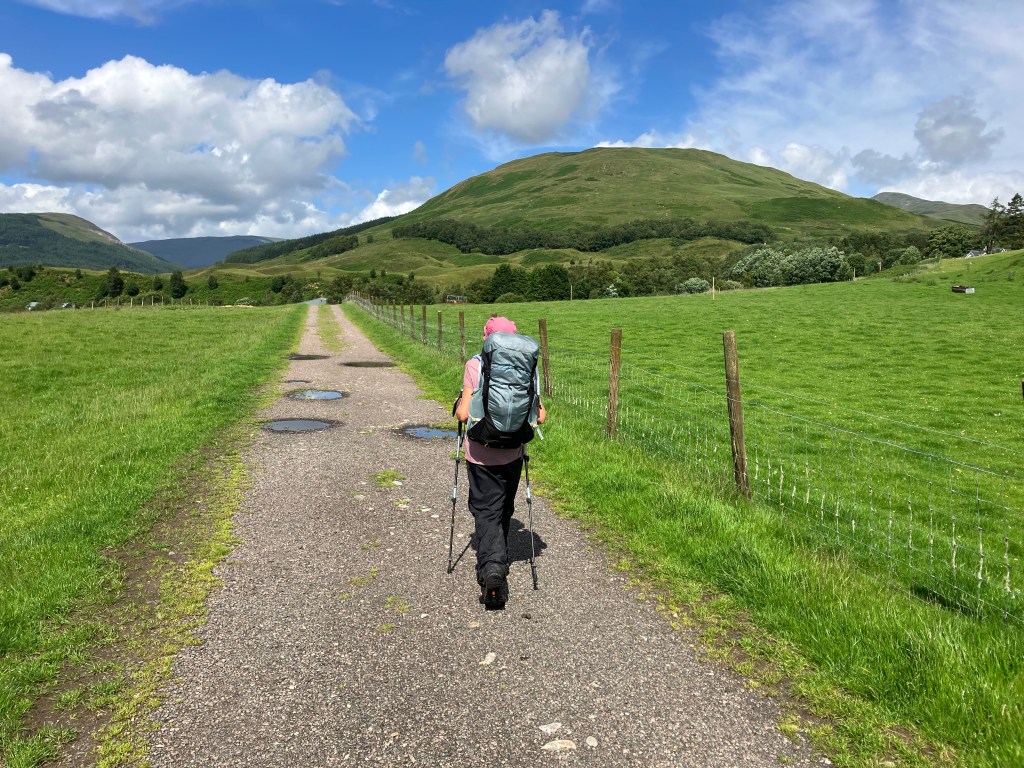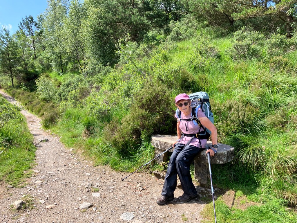 The waitress at our hotel told us that our walk yesterday is the toughest section of the West Highland Way, and today would be ‘a doddle’! I’m not sure I agree with her adjective, but I guess it is all relative! We climbed very steeply through woodland out of Crianlarich, on muddy paths after all the rain. Then as we emerged from the woods the sun appeared and continued to shine all day. We stopped for lunch at Tyndrum, and from there we were walking on General Wade’s Military Road for most of our walk. It is a wide track, winding through the hills and, apart from the streams rushing down the middle of the path, is indeed ‘a doddle’ to walk. But it was two very weary walkers who arrived at our accommodation in Bridge of Orchy: we are loving the amazing Scottish scenery, but looking forward to another rest day in three days time!