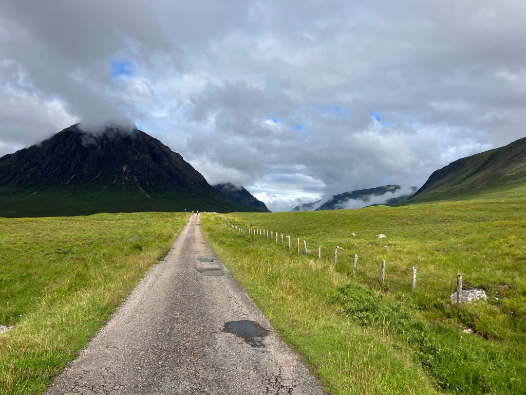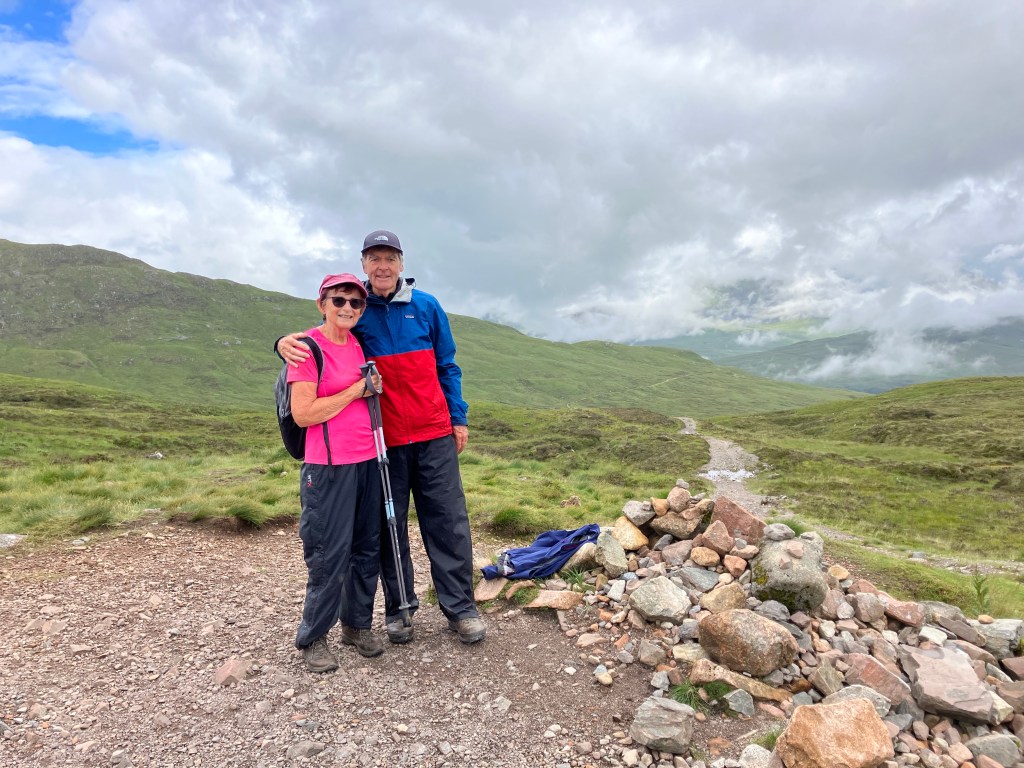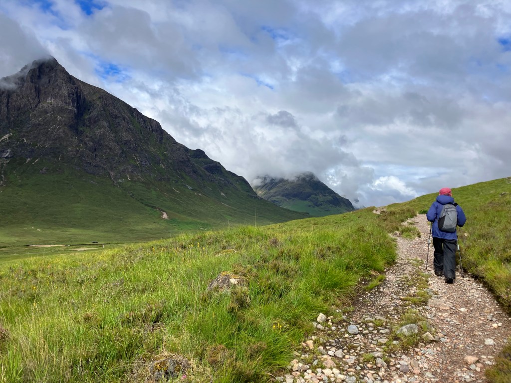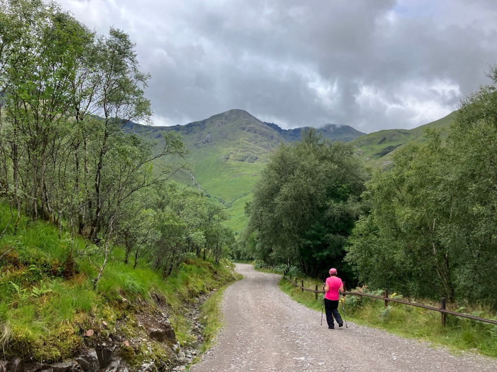 As we were staying a second night in Kinlochleven, we were able to walk without bags today, which was a real bonus. Our taxi driver delivered us back to Kingshouse, and we set off along the Glen Coe valley, with mountains towering above with their peaks in the clouds. Rain was forecast but we were lucky once again. We climbed up on the steep zig zag path known as the ‘Devil’s Staircase’ until we reached the summit: the highest point on the West Highland Way at 548m. From there the sight of mountains ahead of us was amazing, but clouds were too low to identify Ben Nevis. The route across to Kinlochleven was a good road (again General Wade’s road) descending for several miles. We were glad that it was a shorter day, as tomorrow will be a long one.