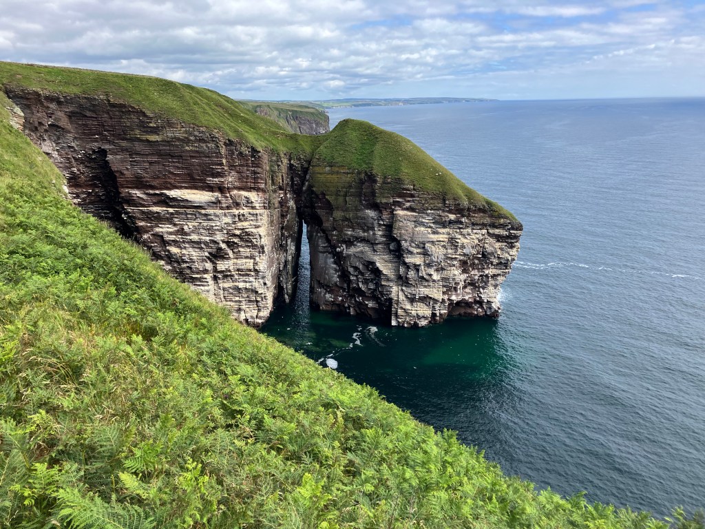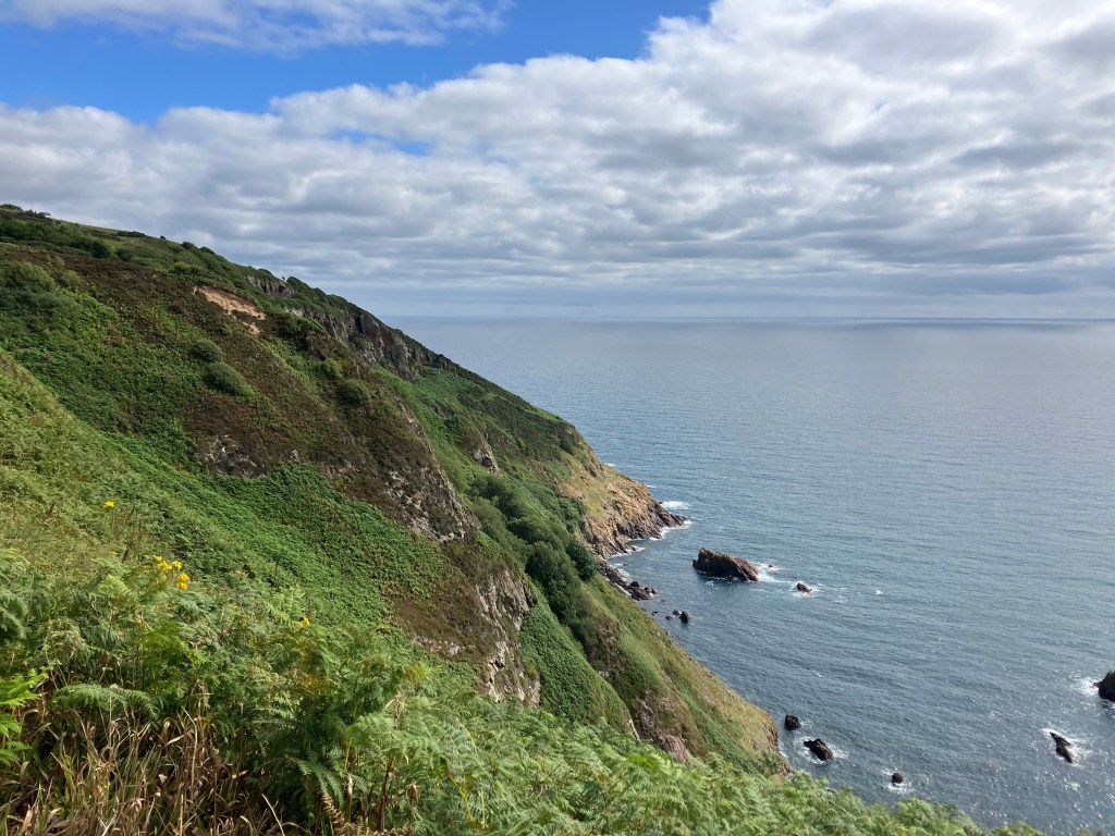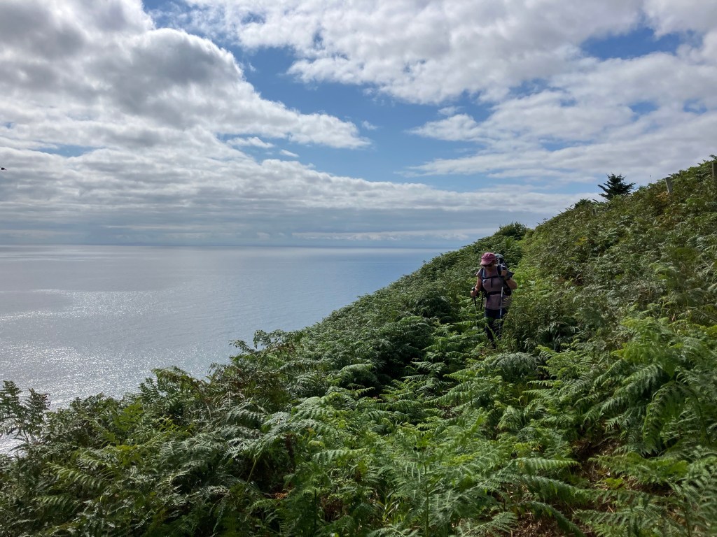 Today’s landscape was similar to yesterday, as we struggled on overgrown paths. However there were fewer ravines to cross and much of the walk was on the seaward side of perimeter fences and drystone walls. The right hand side of the path was mainly edged by steep sloped bracken, but occasionally by steep drops to the sea: not good for someone who doesn’t have a good head for heights! (I was at times tempted to climb over the wall and walk on the other side!) But the views were amazing.