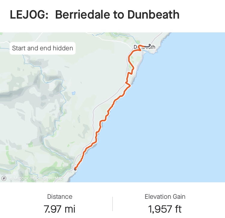 The walk was well signposted, until we were directed inland and reached a small pine forest adjacent to the main A9. Here the signs stopped, and we walked along the path we assumed to be the right one, and emerged in a farm lane. This resulted in a detour down towards Dunbeath Castle, before we finally found our way to the village and then to our accommodation for the night: a bespoke Shepherd’s Hut, surrounded by free range chickens and geese!