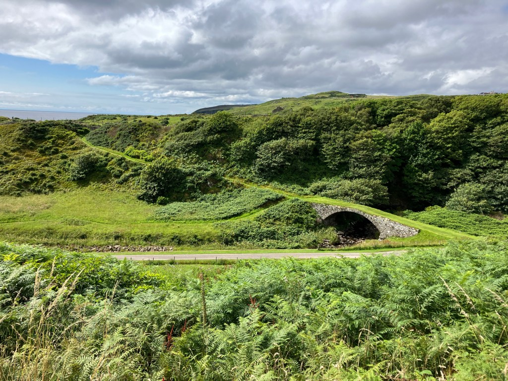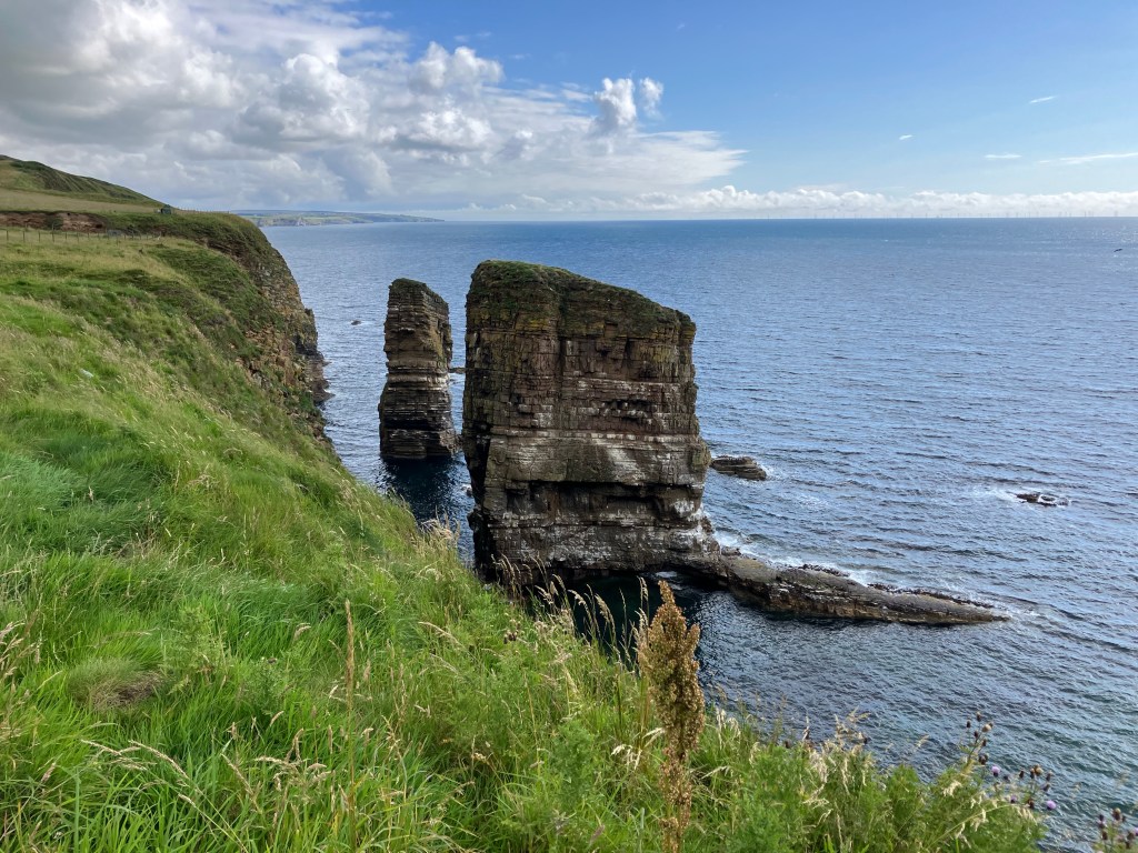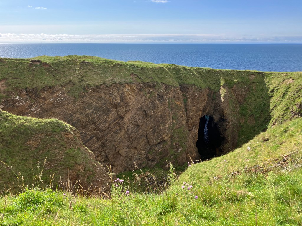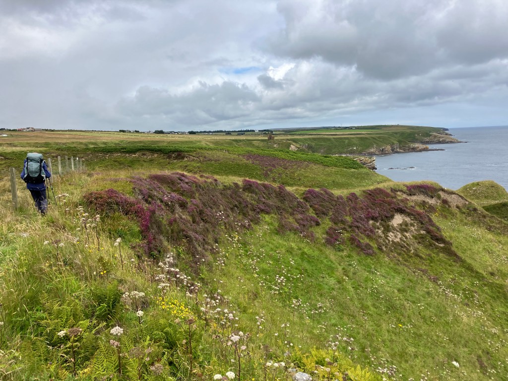 We left our shepherd’s hut and crossed fields to rejoin the trail, in sunshine once more. The trail was again on the seaward side of the fence, and as it was windy and the paths were narrow, we eventually succumbed and crossed into the field to continue our walk. Soon the signs ended and we found the route as confusing as fellow walkers had warned us. We had been directed inland at one point, but gorse bushes and brambles blocked our way, and then there were high deer fences with no gates or stiles. We eventually decided to walk along the road for a while, until we found a lovely path leading back to the coast at Latheronwheel, crossing a river. The next stretch was easier, until we had to walk round a ravine, then descend to cross the river. From there it was a bit of a roller coaster, and we finished our walk alongside the A99 rather than along the cliffs.