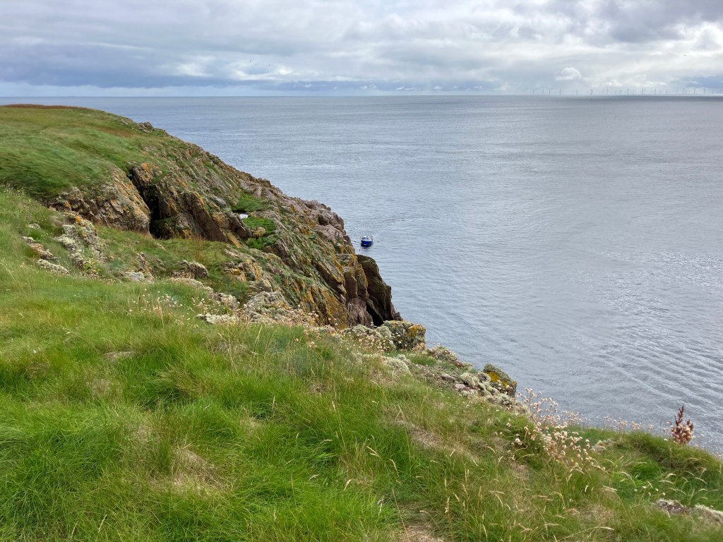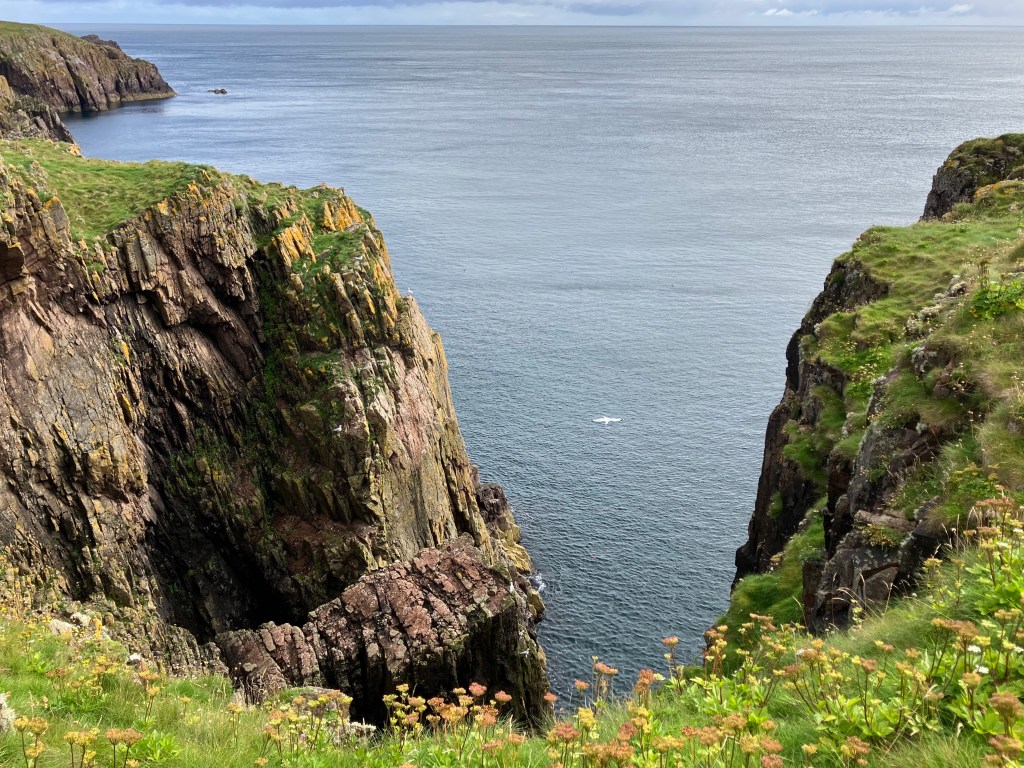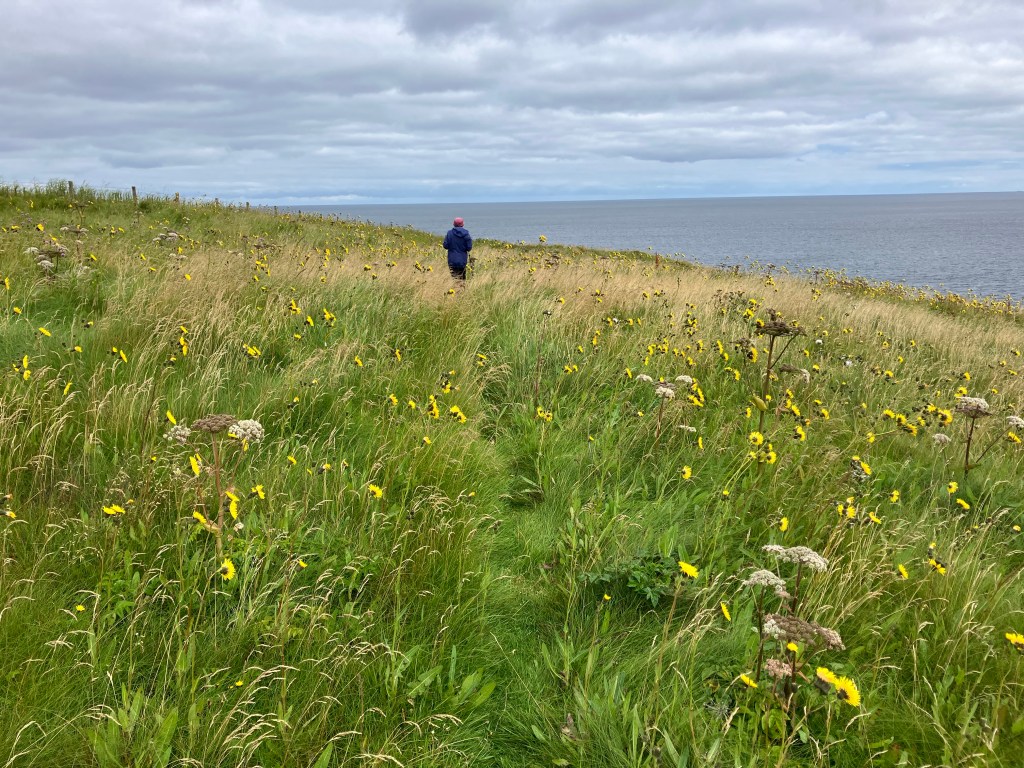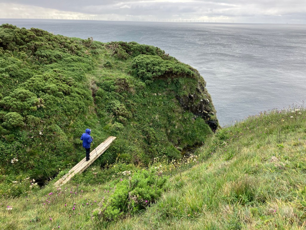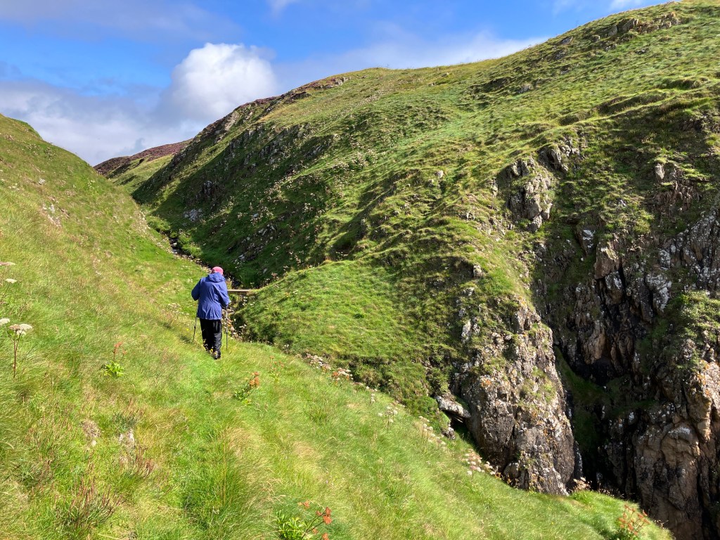 Good clear paths today introducing us to encounters of the precipitous kind, only adding more drama to the continuing dramatic skirting of the cliffs we were making. When proximity to the void got a bit too close for comfort we kept landward of the path wherever we could or hopped over the adjacent fence and took the alternative route for scaredy cats. Probably the most impressive views today and although a bit nippy, a very enjoyable walk with fewer hiking up and down ravines. We saw a small boat lifting lobster pots close to the base of cliffs below us. Old remains of buildings were in many of the coves we encountered, evidence of much more intensive fishing activities in the past. There is evidence of communities along the northern edges of Scotland engaged in subsistence fishing as far back as 7000 BC. A couple of hundred years ago most of the the hardy souls living here made a better living from farming the sea than the land, exporting herring all across Europe where it was considered a delicacy. Thousands of years of slowly evolving human tradition inextricably linked to these shores has suddenly changed over recent decades, replaced by mega trawlers operating remotely far out at sea. Negotiating recent human evolution is as dramatic and scary as the cliff edges around here and it’s no place for scaredy cats.
